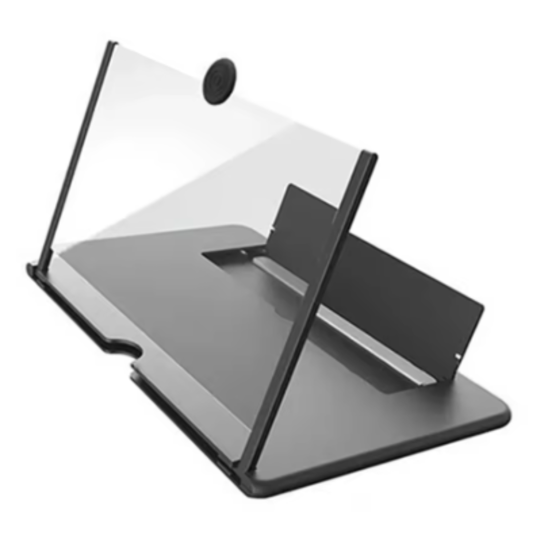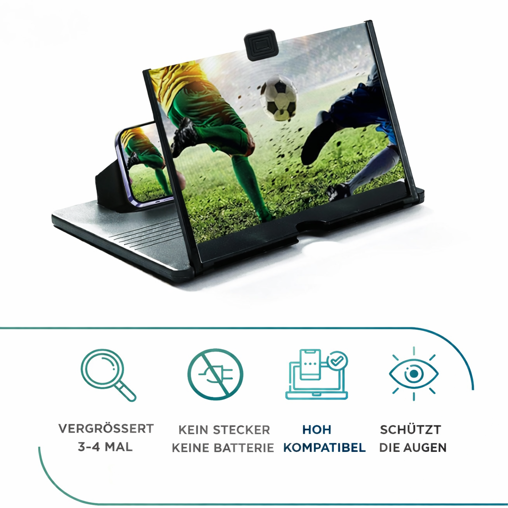 Platziere dein Smartphone einfach hinter der Linse, und der Bildschirm wird sofort vergrößert. Keine Kabel, Apps oder Einrichtung erforderlich.