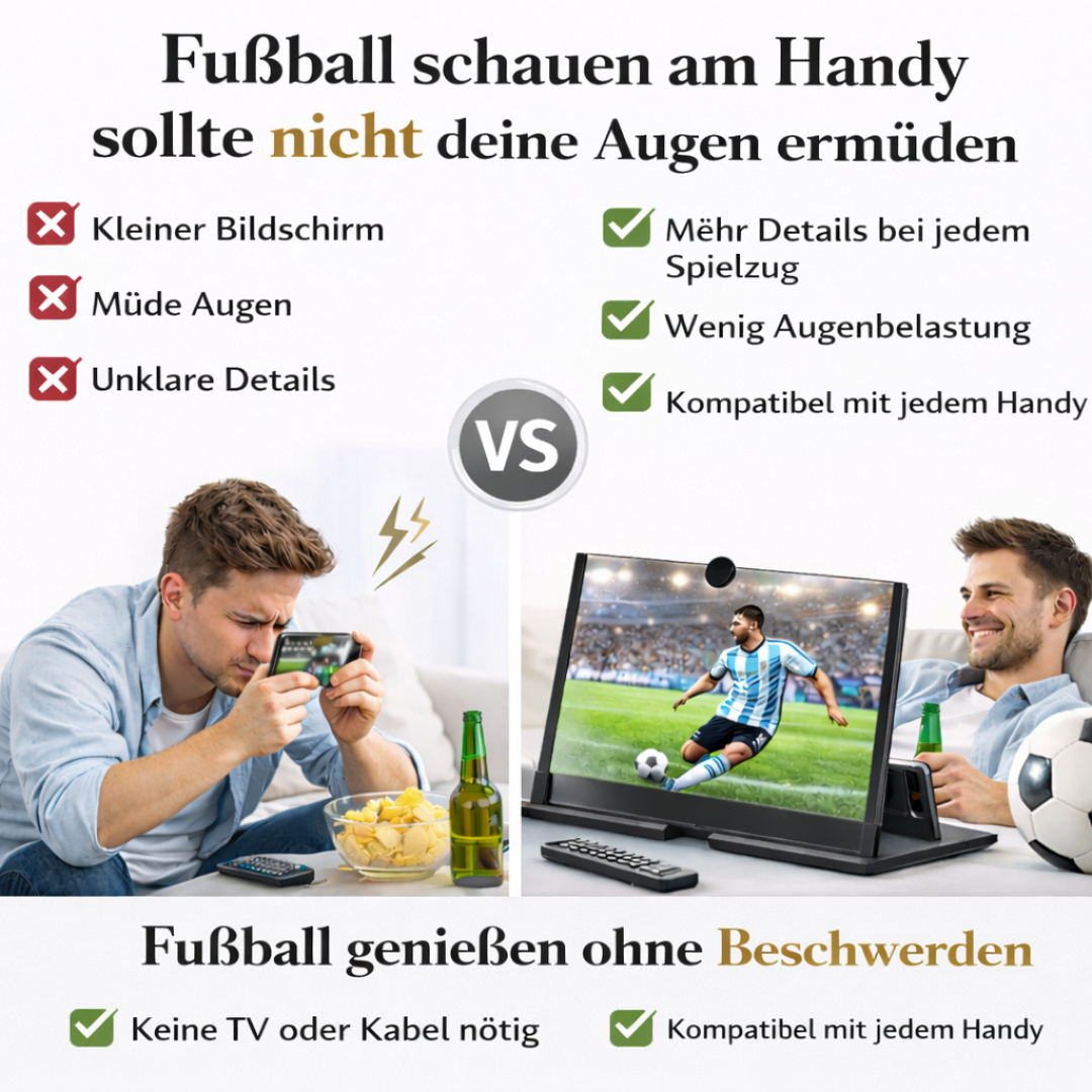 Spiele, Tore oder Wiederholungen auf einem kleinen Bildschirm zu verfolgen wird sehr schnell unangenehm. Man hält das Handy zu nah, die Augen werden überanstrengt und man verpasst Details des Spiels. Und selbst wenn man die Helligkeit erhöht oder die Position ändert, reicht es nicht aus. Fußball zu genießen sollte bequem sein, nicht anstrengend